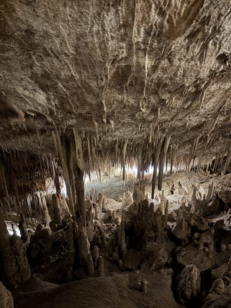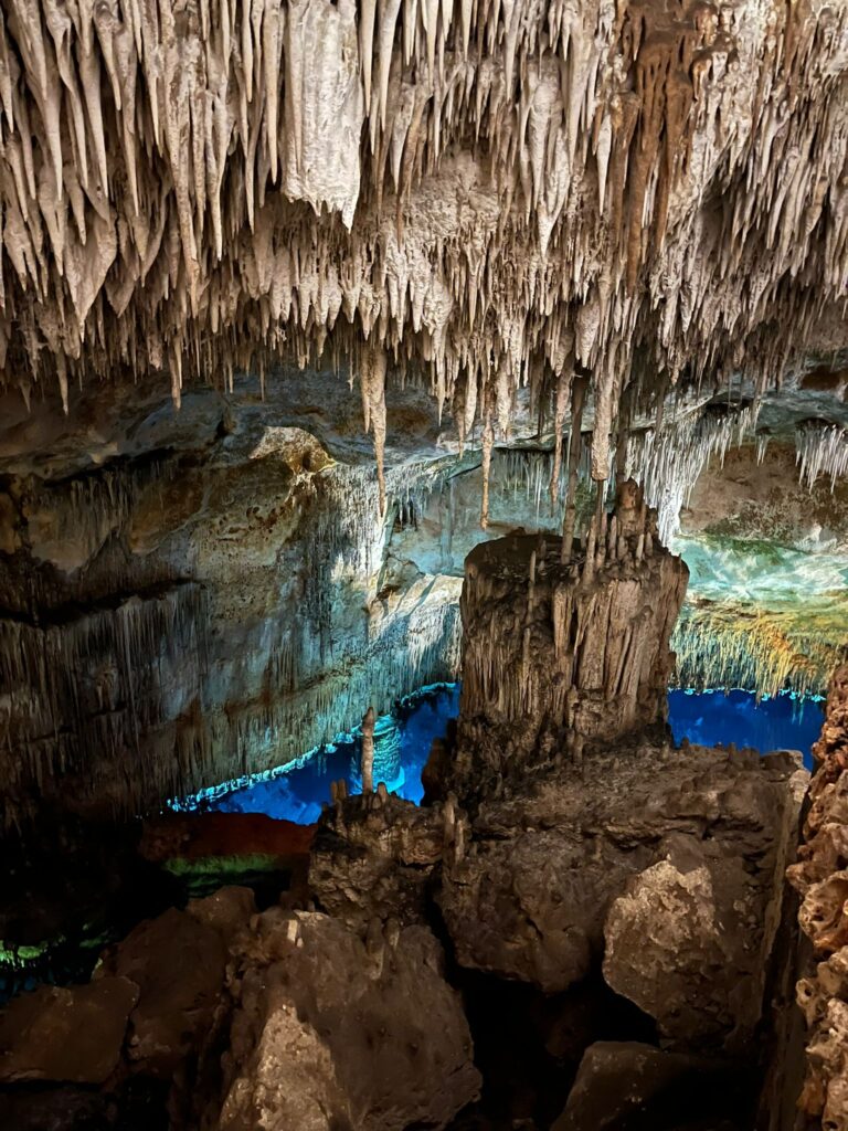 Ook gingen we naar de grotten van Drach, ook wel de drakengrotten genoemd. We dachten daar ’s ochtends wel even tickets voor te kunnen bestellen online, maar alles was al uitverkocht. Dus als je er heen wil, wees er op tijd bij. We besloten tickets voor later op de dag te bestellen, aan het begin van de avond en dat was denk ik een prima zet. Want nu was het ook niet zo vreselijk druk en ook minder warm in de rij etc. Anderen waren er op de gok ’s ochtends gewoon naar toe gereden en konden aan de kassa nog wel tickets kopen. Maar die gok durfden wij niet te nemen. In de grotten is het Martelmeer, één van de grootste ondergrondse meren ter wereld en tijdens elk bezoek een live klassiek concert op het meer, met bootjes die langsvaren. Maar het meest indrukwekkend vonden wij de stalactieten/stalagmieten, natuurlijke rotsformaties van kalksteen. Erg gaaf om te zien en het levert mooie plaatjes op! Ik had gelezen dat mensen zich wel opgejaagd voelden tijdens de rondleiding. Dat begreep ik wel, je mocht eigenlijk niet stilstaan om te kijken of foto’s te maken. Medewerkers begonnen dan meteen met hun zaklamp te schijnen dat je door moest lopen. Vervolgens hebben we heel lang moeten wachten tot het klassieke concert begon. En werden we in een (overvol) bootje naar de andere kant gebracht. Dat stelde niet zoveel voor. Jammer! Ik vond het wachten in de drukte tussen honderden mensen niet fijn. Na afloop mochten we door de grotten weer omhoog. Dat was eigenlijk het leukste moment, want daar waren geen medewerkers en kon je rustig kijken.