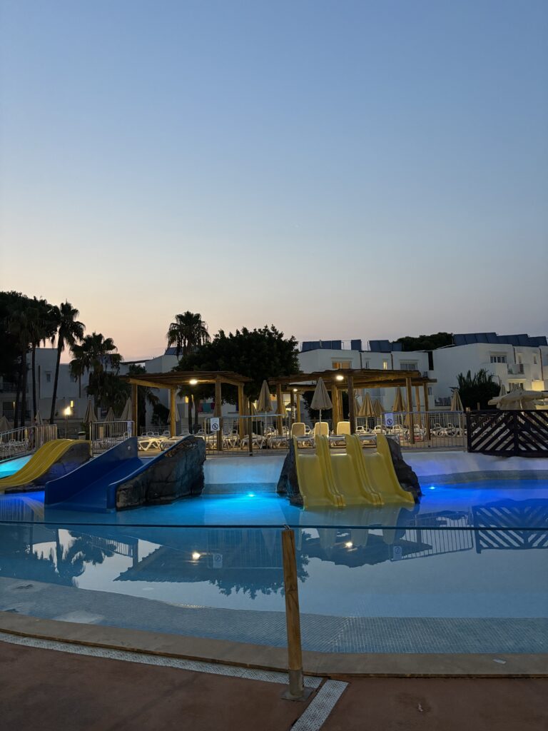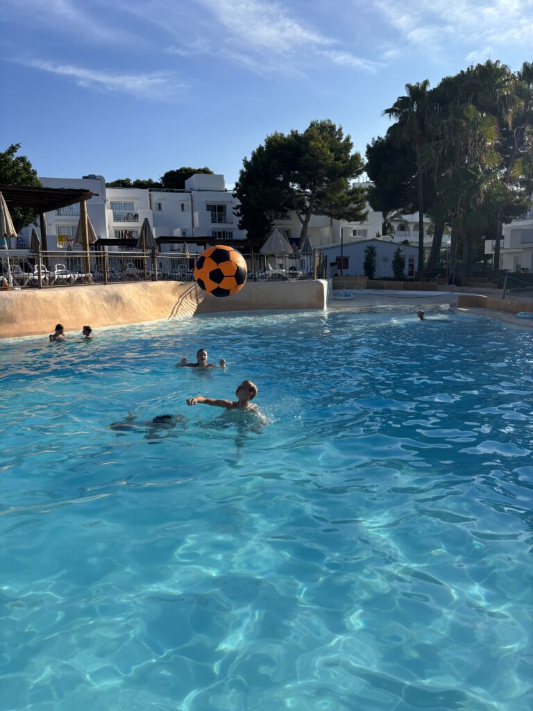 Sunweb geeft op hun website aan dat de transfer naar Cala d’Or zo’n 100 minuten is. Best lang vergeleken met de vliegreis, maar dat namen wij voor lief! Een mooi plekje op het eiland is ook wat waard. Beide keren hebben wij er een klein uur over gedaan, dus dat was prima te doen. Wij hadden het 2-kamer appartement gerenoveerd geboekt. Deze is geschikt voor 3 tot 5 personen max. 3 volwassenen en 2 kinderen t/m 14 jaar. En terwijl ik dit schrijf realiseer ik me dat we dit appartement nu dus niet nog eens zouden kunnen boeken, want Naomi is inmiddels ook 15 geworden. Het is nog best lastig hoor om leuke, betaalbare hotels/campings te vinden voor ons gezin van vijf. De tieners worden al gauw als volwassenen gezien en dat maakt het extra lastig. Het appartement waren twee aan elkaar gelegen slaapkamers met airco en vanuit 1 slaapkamer kon je dan naar de badkamer met bad/douche en toilet. Jesse sliep bij ons op de kamer. De airco vond ik niet zo denderend, als je het al een airco kon noemen. Bij aankomst deed hij het ook niet, dus er moest eerst een monteur komen. Die beaamde dat hij stuk was en eigenlijk maar op 1 stand kon. We lieten hem op zijn koudst zetten, maar soms was dat in de nacht eigenlijk te koud. Hij kon dan dus niet een standje zachter, maar alleen op die koude stand of uit. Ik vond het meer een ventilatiesysteem. De andere slaapkamer kreeg er ook weinig van mee. De bedden waren keihard! Dus mocht je hierheen (willen) gaan, bereid je voor. Verder echt een heel groot balkon. Ons appartement was gelegen op de 1e verdieping, je moest dus met een trap omhoog. Wij hadden all-inclusive. Heerlijk eten ’s ochtends, ’s middags en ’s avonds en als je wilde tussendoor. Voor ieder wat wils en wel gevariëerd. Wij waren best enthousiast. Af en toe was er ook sushi. Een keer een broodje hamburger wat je zelf kon maken. De kinderen waren vooral vaste klanten van de snackbar bij het zwembad. Daar kon je tosti’s bestellen en patat en kipnuggets etc. Leuke animatie, mini-disco en bijna elke avond wel een avondshow. Er is ook een sportschool, voetbalveld, een gamehal en een wellness-gedeelte.